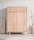Realizzato in rovere massello con finitura sbiancata, coniuga resistenza e un look leggero e moderno, perfetto per diversi stili d'interni. Il mobile è dotato di un ampio cassetto superiore e di quattro ripiani interni dietro due ante, offrendo spazio a sufficienza per riporre ordinatamente diverse paia di scarpe.