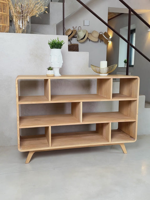 A low bookshelf Modena crafted from solid oak wood with a whitewashed finish, showcasing a natural yet modern look. The Modena design highlights smooth, rounded edges and clean lines, making it a perfect blend of functionality and style. Measuring 130x45x89 cm, this bookshelf offers a compact yet spacious storage solution with a total of 8 open shelves. Its versatile layout is ideal for organizing books, displaying decorative items, or storing everyday essentials. The sturdy construction and tapered legs ensure durability while adding an elegant, contemporary touch to living rooms, bedrooms, or offices.