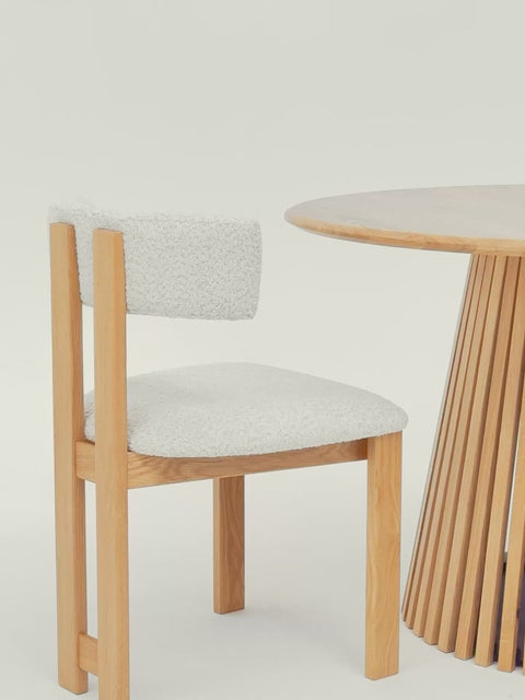 The Angelo chair is an elegant combination of oak wood and boucle fabric, perfectly suited for modern interiors. Its dimensions are 49×51×79 cm, with a seat height of 44 cm.